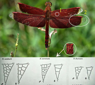 Gambar tersebut menunjukkan bentuk sayap capung dengan pola tepi warna merah melengkung tajam hingga nyaris ke pangkal sayap. Ciri tepi warna merah tersebut dimiliki oleh spesies N. fluctuans. Spesies ini dapat dibedakan dari N. ramburii dan N. terminata karena warna merah pada tubuhnya yang lebih cerah dan ukuran tubuhnya yang paling kecil. Gambar 2 adalah spesies N. ramburii, tampak memiliki pola tepi warna merah yang hampir mirip dengan N. fluctuans, hanya saja tepian merah ini tak sedalam N. fluctuans. Gambar 3 merupakan spesies N. terminata. Spesies ini paling mirip dengan N. ramburii karena memiliki ukuran tubuh yang sama dan warna merah yang lebih gelap. Perbedaannya yaitu N. terminata memiliki sayap transparan lebih sempit dengan pola warna merah bertepi lurus.