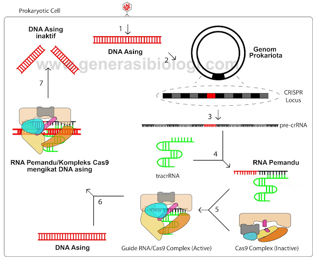Keterangan dari Gambar 3 tersebut yakni, (1) pada saat DNA asing masuk ke dalam sel, maka dengan segera (2) fragmen DNA asing tersebut akan direkam sebagai memori genetik dan disimpan dalam spacer yang disebut dengan tahapan akuisisi DNA. Ketika ada virus dengan fragmen DNA yang sudah pernah direkam, langkah selanjutnya adalah pemrosesan crRNA. (3) Gen CRISPR akan melakukan transkripsi menghasilkan CRISPR RNA (crRNA) sedangan gen Cas9 akan menghasilkan protein Cas9.