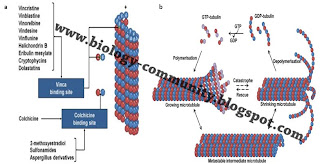 Gambar 1. (a) Senyawa-senyawa antimitotik yang mendepolimerisasi mikrotubul, (b) siklus polimerisasi dan depolimerisasi mikrotubul (Calligaris et al., 2010). Klik gambar untuk memperbesar.