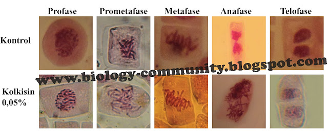 Gambar 3. Perbandingan tahapan fase-fase mitosis antara perlakuan kontrol (atas) dan perlakuan dengan kolkisin (bawah). Klik gambar untuk memperbesar.