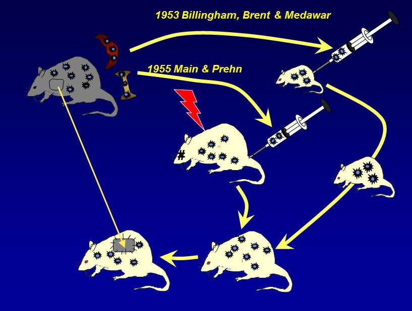 | Gambar 1. Percobaan yang dilakukan oleh Medawar, Brent, dan Billingham menggunakan transplantasi kulit pada tikus. |