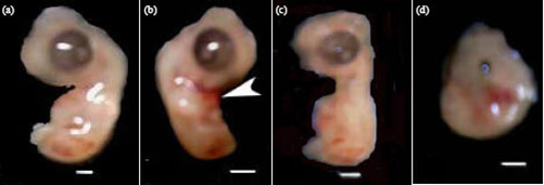 Gambar 1 Embrio usia 7 hari (a) kontrol; (b-d) Embrio yang mengalami abnormal pada perlakuan enrofloxacin
