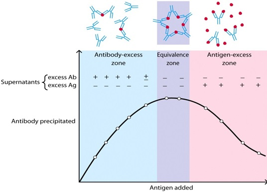 - Zone of excess antigen adalah ketika jumlah antigen banyak tetapi antibodi sedikit. Akibatnya proses presipitasi tidak berjalan dengan sempurna. Pada kondisi tertentu, ini dapat menyebabkan penyakit pada manusia yang disebut dengan serum sickness.