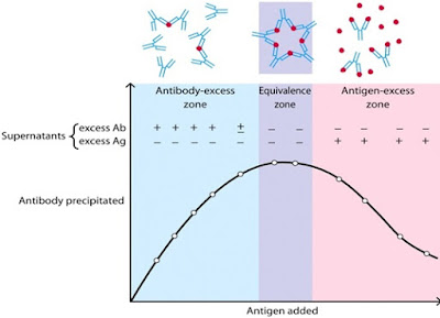 - Zone of antibody excess adalah kondisi ketika konsentrasi antigen sangat rendah dibandingkan jumlah antibodi. Dalam kondisi ini, proses pembentukan kompleks tetap terjadi, tetapi endapan tetap dalam jumlah sedikit dan terdapat pada supernatant.