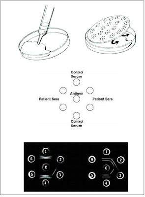 - Immuno-electrophoresis. Antigen a dan serta antigen b dan c masing-masing ditaruh pada titik yang berbeda, tetapi sejajar satu sama lain. Kemudian melakukan elektroforesis selama 60 menit. Setelah itu diberikan antiserum terhadap antigen a,b, dan c. Setelah itu melakukan immunodifusi selama 24 jam pada suhu 24°C. Kemudian akan terjadi migrasi pada antigen.